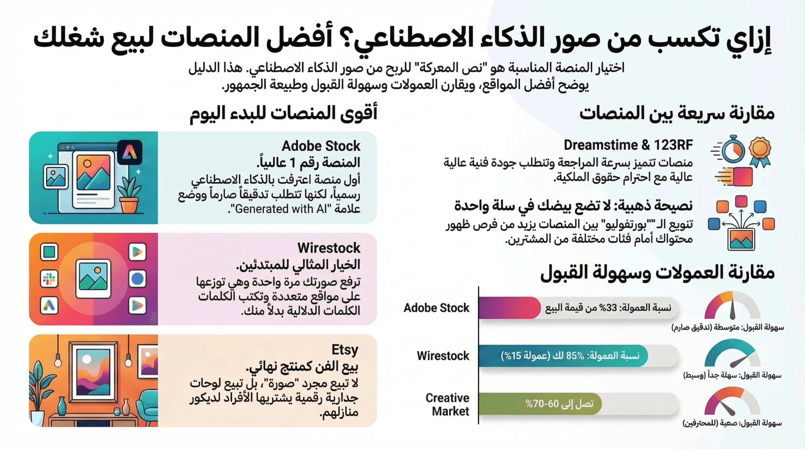 اختيار المنصة المناسبة هو نصف المعركة. ليست كل المواقع ترحب بالذكاء الاصطناعي، والبعض الآخر يضع شروطاً خاصة. إليك قائمة بأقوى المنصات التي يمكنك البدء فيها اليوم لتحقيق الربح من بيع الصور المولدة بالذكاء الاصطناعي.